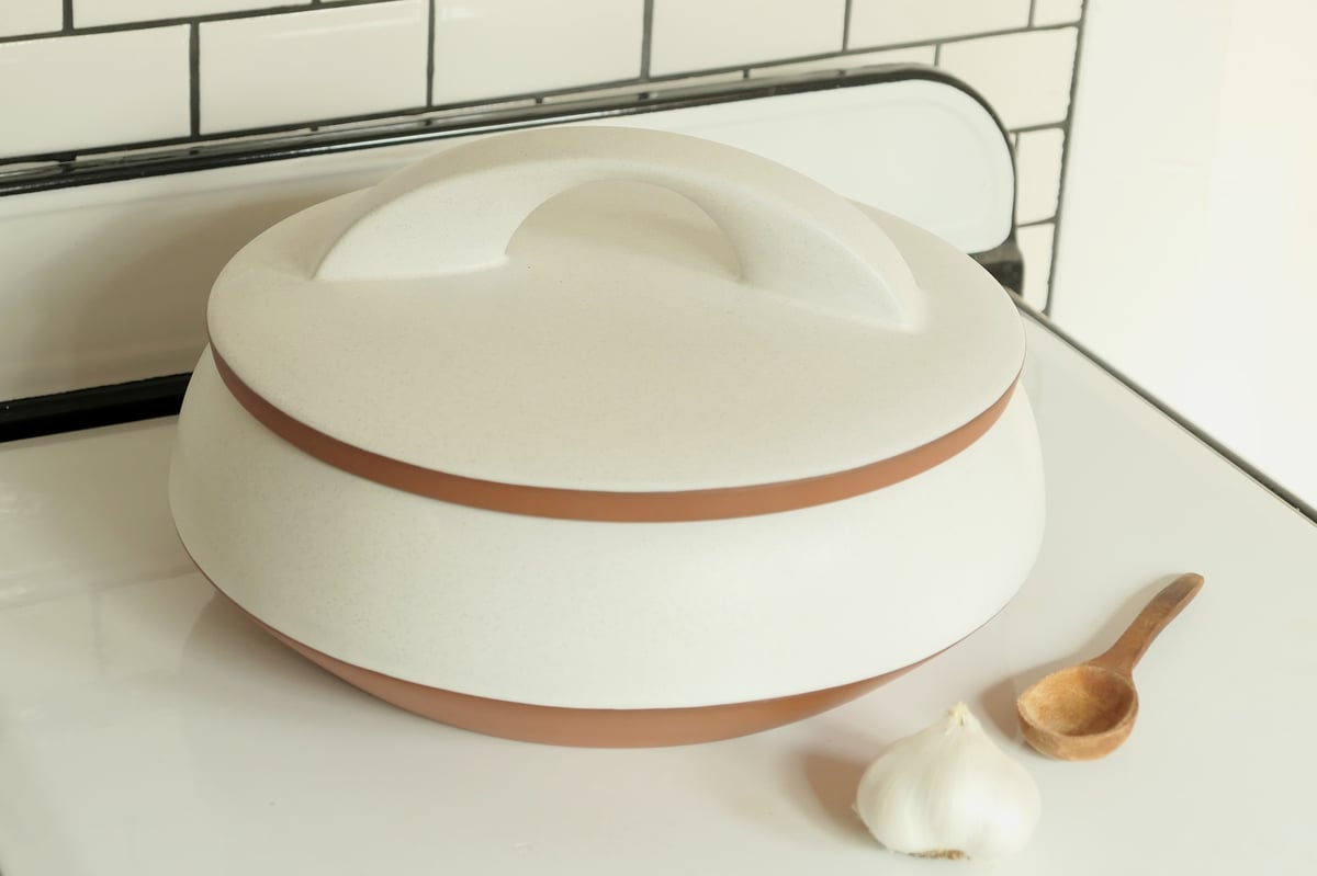 Highly functional covered casserole, three quarts. Bake your favorite bean recipe or take your pasta salad on the porch. Keeps food hot and safe from summer flying pests! Put the leftovers right into the refrigerator.